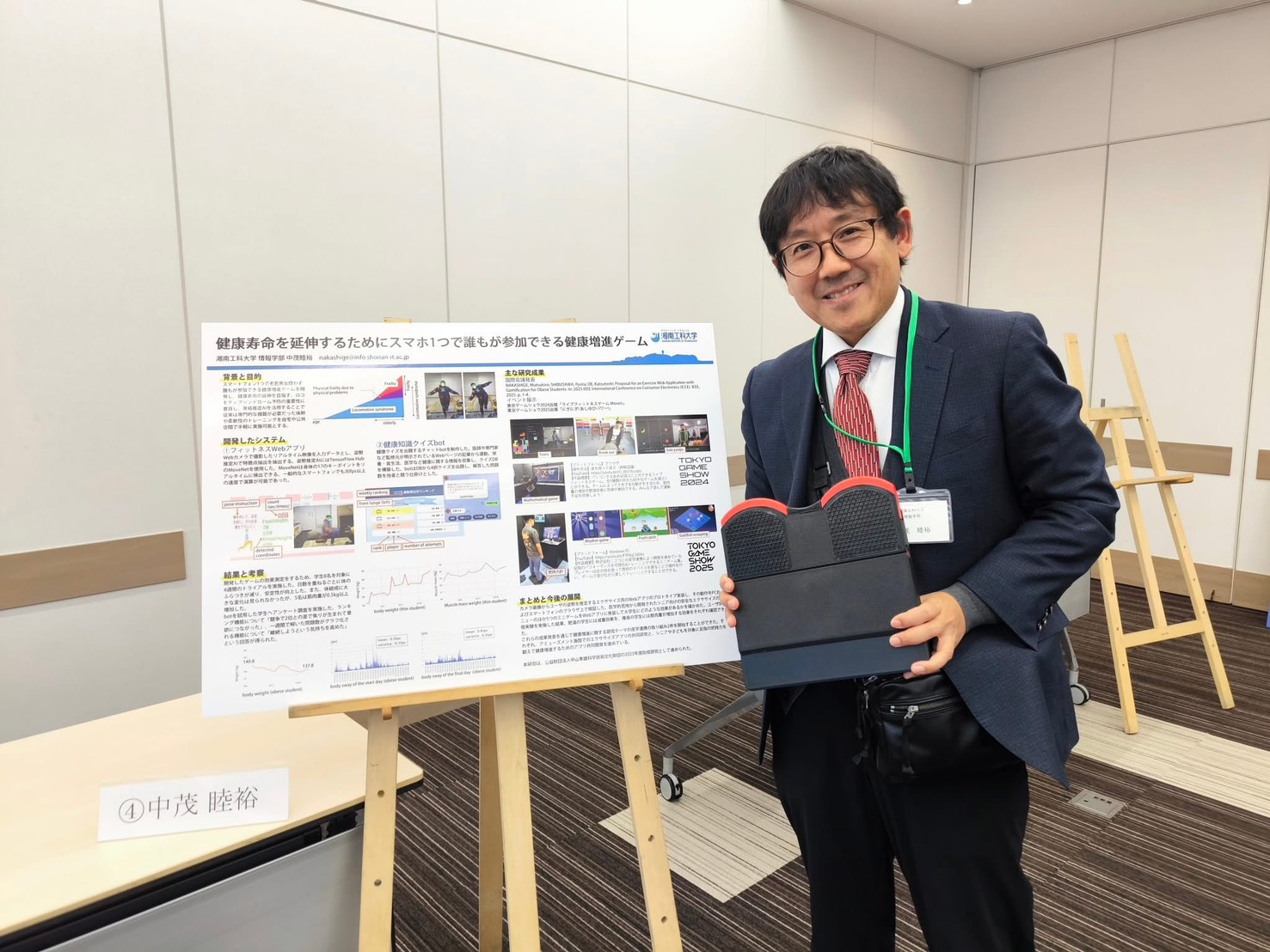 11/7(金)に場所ステーションコンファレンス東京で開催された中山隼雄財団の研究成果発表会で教授の中茂先生がポスター発表をしました。研究テーマ「健康寿命を延伸するためにスマホ1つで誰もが参加できる健康増進ゲーム」への助成で実現した東京ゲームショウ2025への出展や、その後のご縁で開始した産学連携プロジェクトの進捗報告をしました。