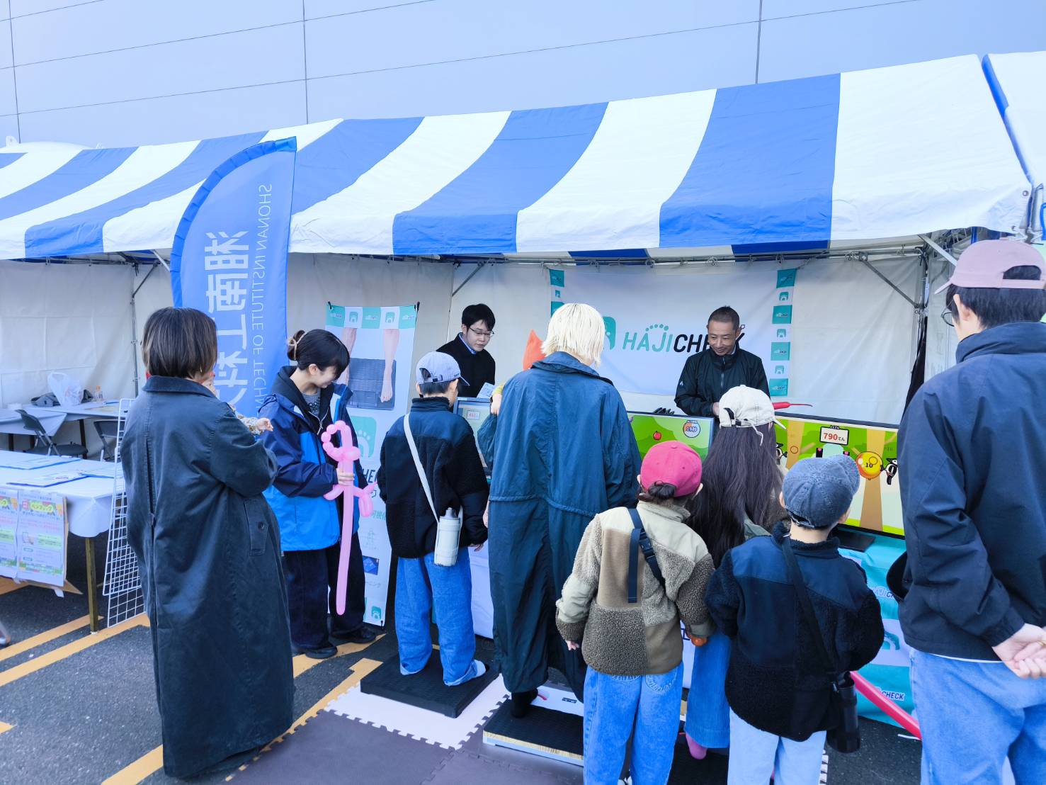 研究室からは、情報学科3年の佐川大介さん、千田賢介さん、德田蒼来さん、矢部智大さん、情報学科2年の野村悠介さん、宮澤歩実さんの計6名が参加しました。展示内容は株式会社ニフコとの産学連携で開発している足指の把持力を鍛えるゲームHAJICHECKと情報学課題解決実習でベスト発表賞を獲得した「もぐらたたきをご家庭でも」を来場者に体験していただきました。遊んでいただいた方にはバルーンアートも配布しました。