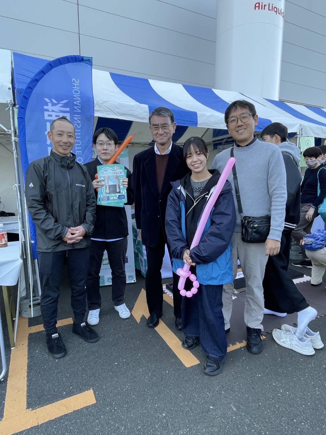 ちょうど来場していた河野太郎衆議院議員にも使っていただき展示スタッフみんなで記念写真をパシャリ。
