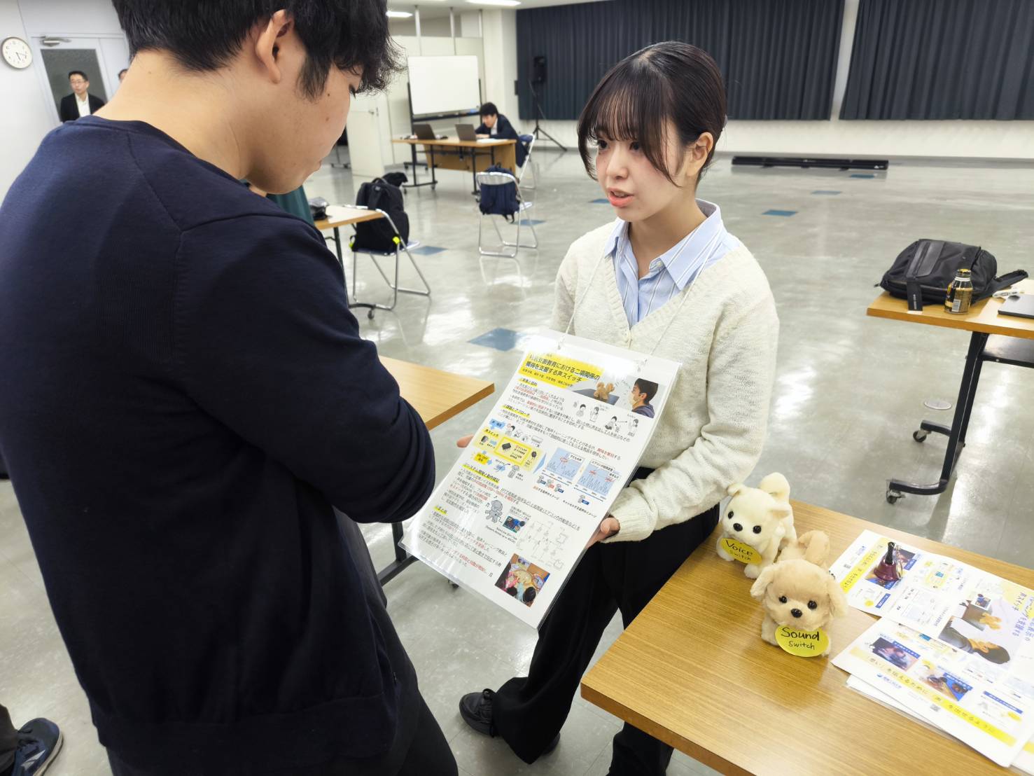 9/20(土)におこなわれたオープンキャンパスで、情報学科情報工学専攻3年の常田涼太さん、同じく情報メディア専攻3年の大熊涼羽さんが研究展示・発表しました。展示・発表のタイトルは「授業で積極的に発言できてる?」で、情報学課題解決実習で取り組んだ研究テーマの成果物です。学部内で7/24(木)に実施したポスター展示・発表で多くの票数を集めたことで選出されました。