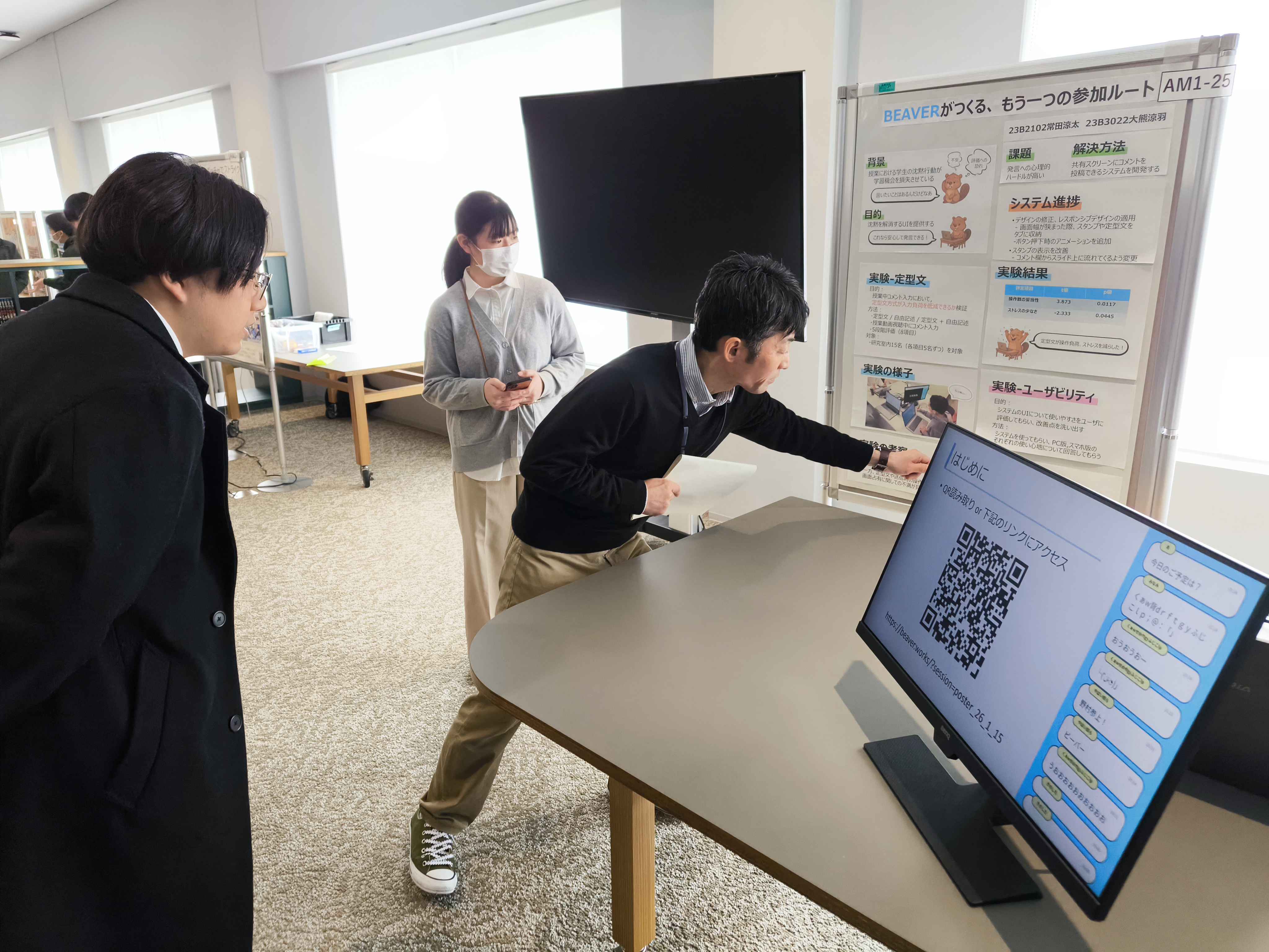 3名の学生が説明に立って開発した機材をデモンストレーション展示しました。