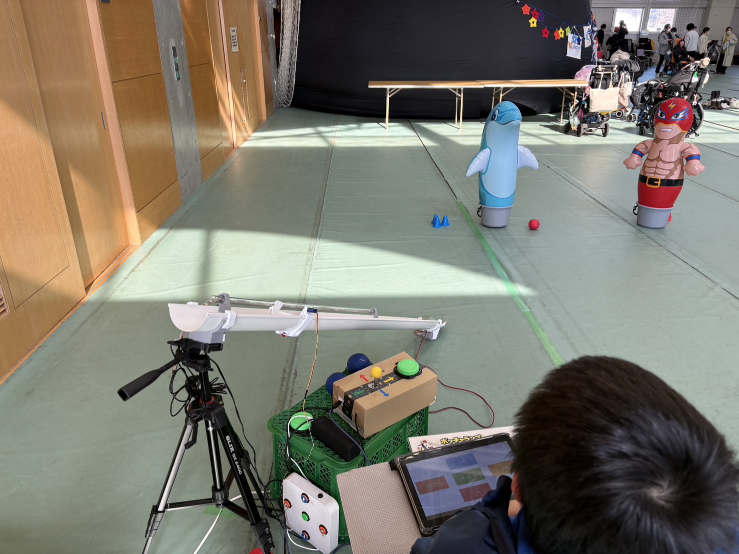 「ボッチャランプ」「ラジコンルンバ」「音スイッチおもちゃ」を体験して頂き、ボッチャランプでは「3,2,1,発射」のリズムでスイッチを押している子がいたり、音スイッチのおもちゃを使って犬の散歩をする子がいたりと楽しんで頂けたようです。