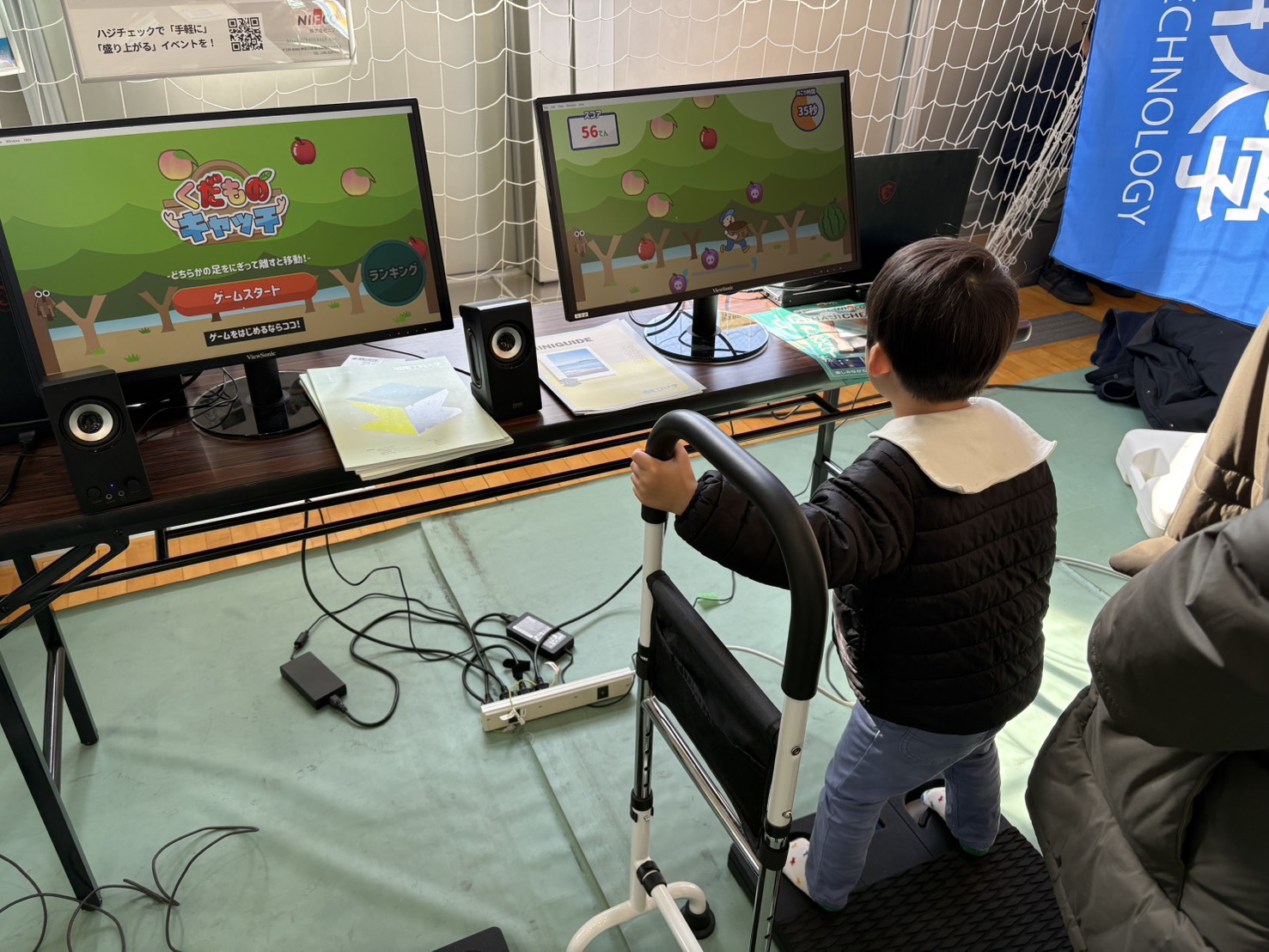 展示内容は、株式会社ニフコとの産学連携で開発している足趾把持力の測定・トレーニングを促進するためのゲームアプリ、姿勢推定AIを使うことで横跳びしたりしゃがんだりジャンプしたりと自分の身体をコントローラとしてプレイできるゲーム「体がコントローラ! 動いて狙って撃つ 3ラインシューティング」、ロコモティブシンドロームを予防する効果があるとされる下半身の筋力を鍛える4つの動きを姿勢推定AIで確認しながらトレーニングするアプリでした。