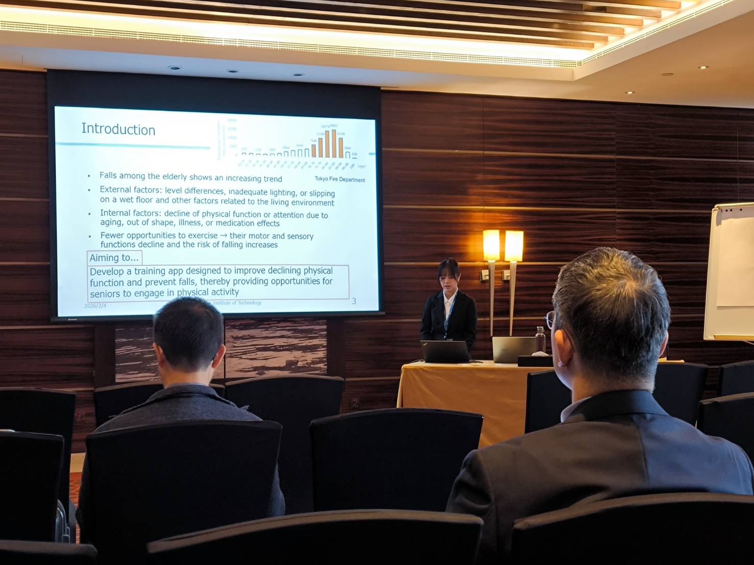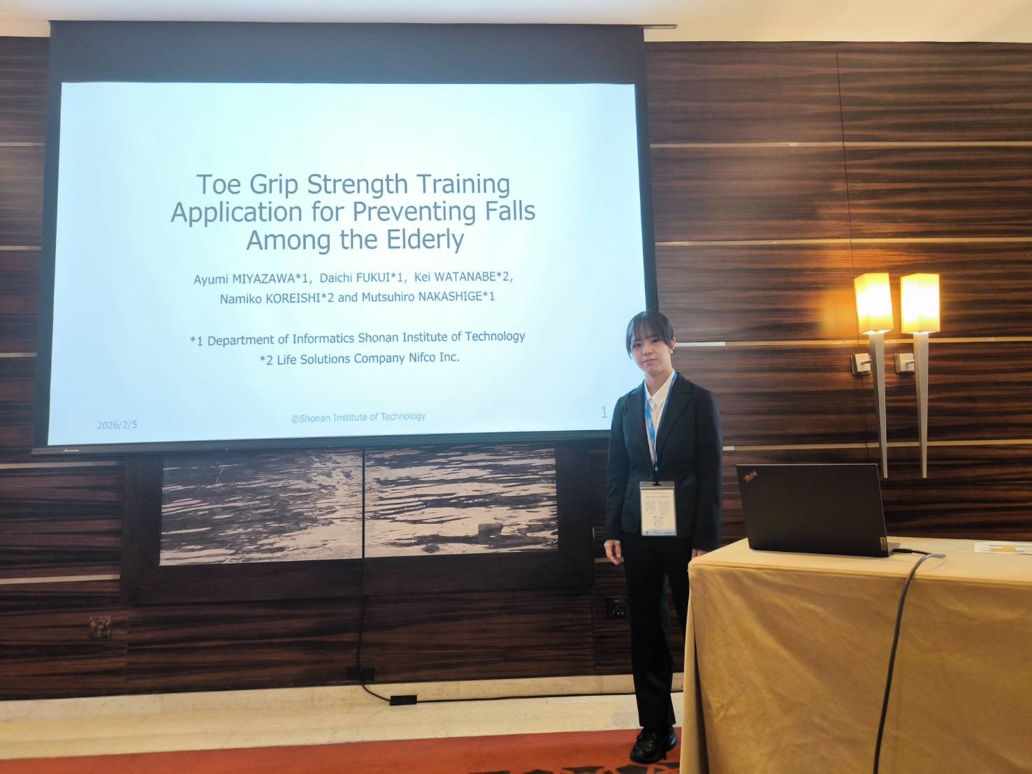発表内容は、株式会社ニフコとの共同研究で取り組んでいるシニアの転倒防止を図るためのデバイスとエクササイズアプリの評価に関するものです。題目と著者は下記のとおりです。