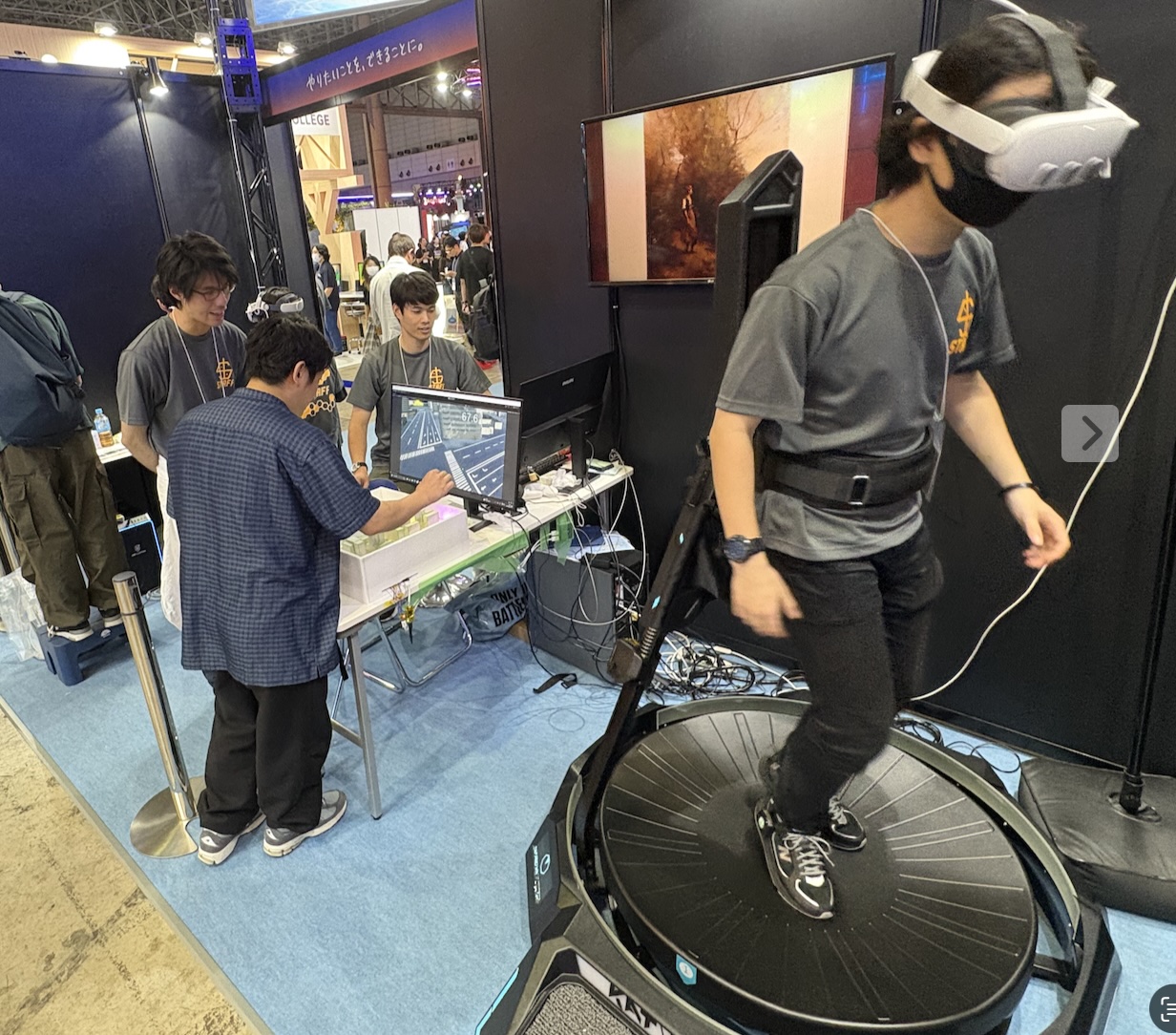 Save The Cat:TGS2025ではTGS2023は、KATVR社から歩行デバイスを貸していただき,大幅スケールアップ。プレイヤーは、みなとみらいの街並みを走り回りながら猫を追う体験を実現。実際のみなとみらいのジオラマには、プレイヤーと猫の位置がLEDで表示され、リアル側のプレイヤーはジオラマ内に障害物を設置して捕獲を阻止するゲームです.