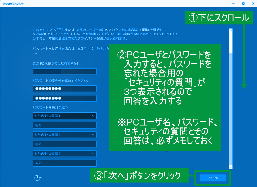 ②3つの質問と回答を入力する。ローカルアカウントとセキュリティの質問と回答は、必ずメモしておいてください。