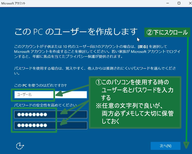 ➂入力が終わったら、「次へ」ボタンをクリックします。