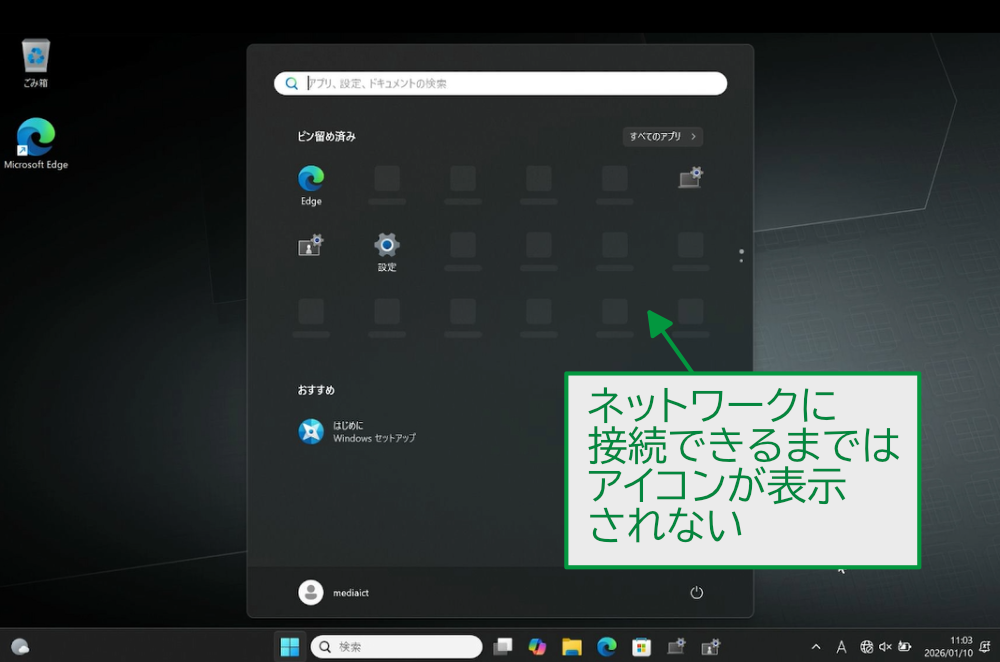 また、WiFiに接続できると、最初のログイン時にWindowsのスタートメニューで表示されていなかったソフトウェアのアイコンが表示されるようになります。