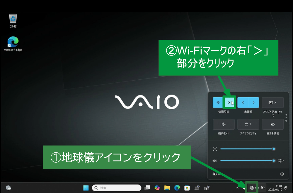 ① 画面右下のネットワークアイコン(地球マーク)をクリックします。