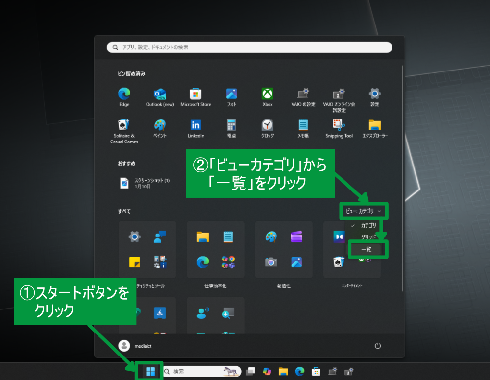 ①スタートボタンをクリックします。