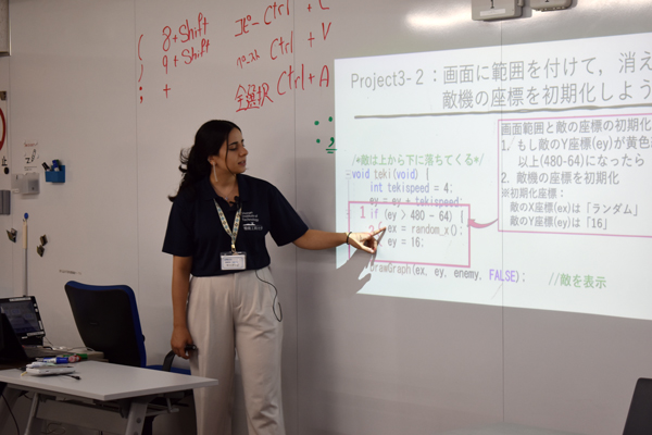 • プログラミングの基礎やどのように動いているかを分かりやすく教えてもらえたので理解することができました。教科書通りに⼊⼒するところもあれば、⾃分でオリジナリティを出して行うこともあり、⾃分でプログラムしたものが動いたときにはとても感動しました。