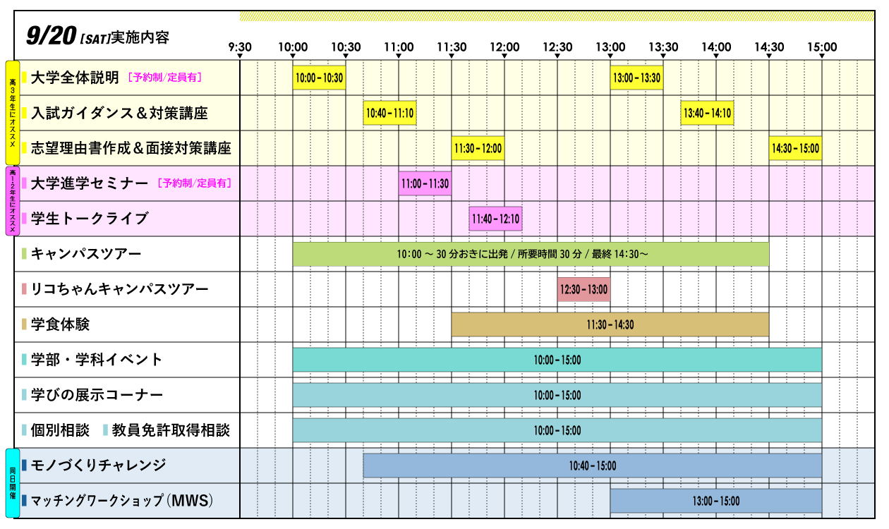「大学全体説明」「大学進学セミナー」には定員があります。参加を希望される方は、参加希望時間を確認の上、お早めにお申し込みください。