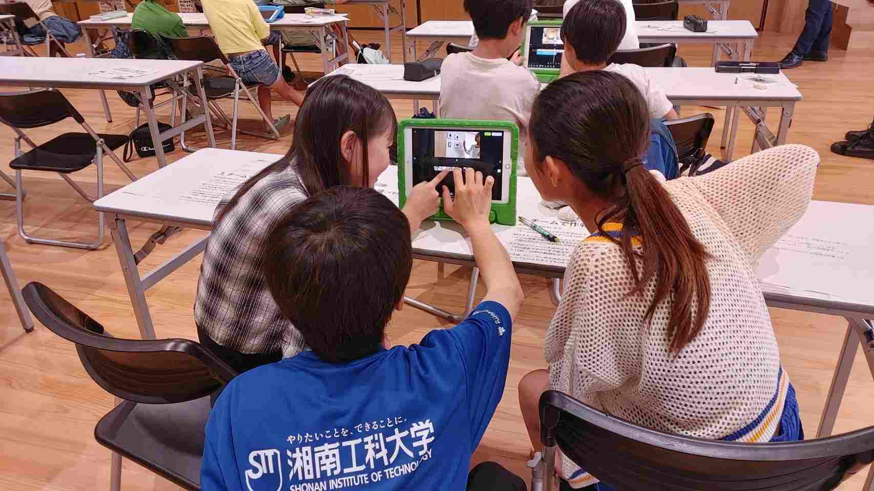 本企画は、子ども向けプログラミング教室を運営するSmileMe株式会社の協力のもと、湘南工科大学の学生4名がサポートとして参加。参加者は2人1組となり、センターから貸与されたiPadを活用して、施設内の各所を紹介する短編動画の制作に取り組みました。