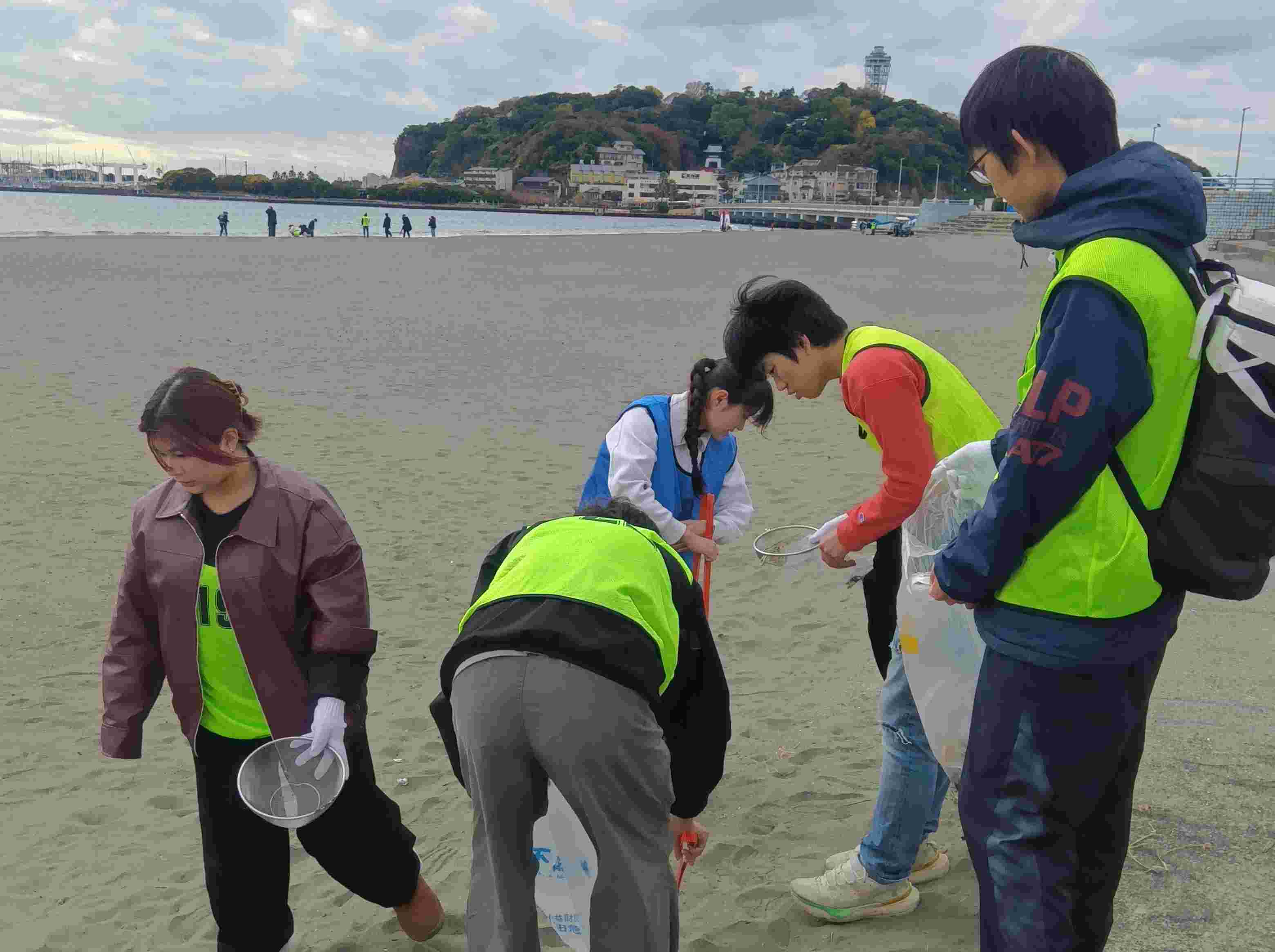 船が戻るまで、それ以外の学生は片瀬西浜ビーチクリーン活動を実施し、船が戻ってから海底ゴミ仕分けを手伝いました。
