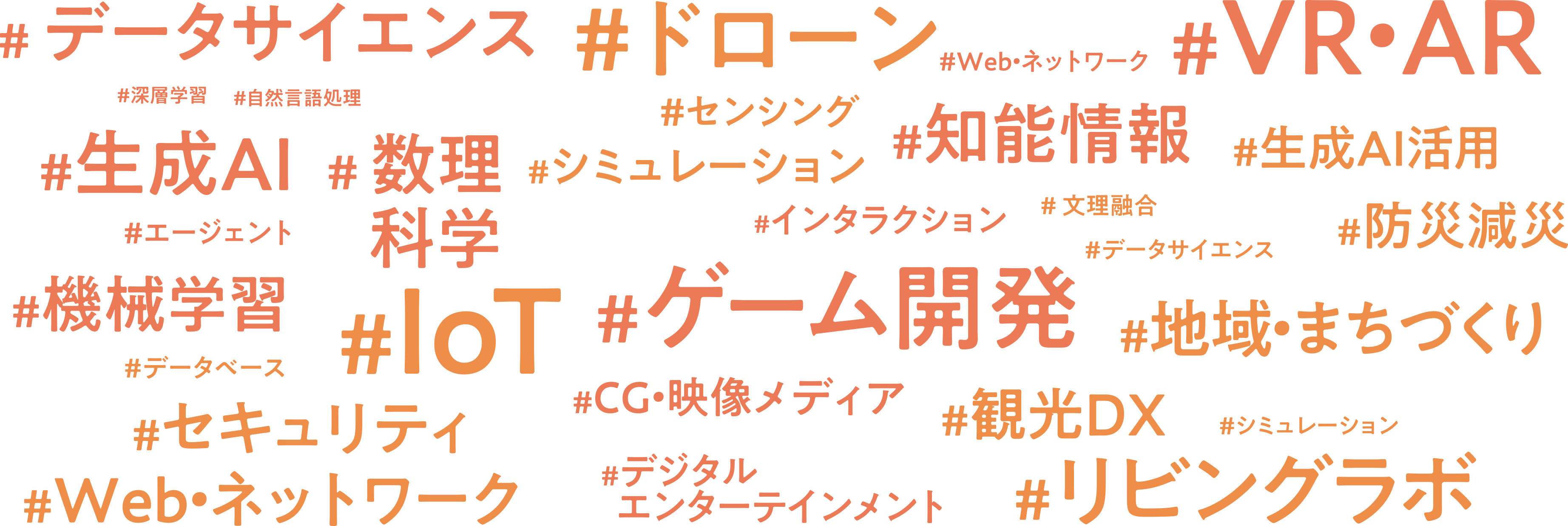 ゲーム、映像、CG、VR・ARなどのデ ジタル表現技術を横断的に学修。 Webやアプリ開発、ユーザー体験設 計も含め、人・モノ・情報をつなぎ、新 たな共感や価値を生み出すデジタルコンテンツの創造力を磨きます。