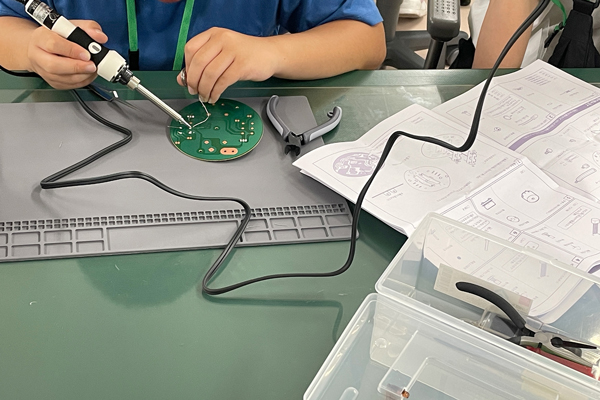 基板に回路をはんだ付けし、回すとLEDが点灯してメロディが流れる「光るオルゴールごま」と、図面作成から重力・揚力・重心などを考えながら進める「トンダ―君」(模型飛行機)の製作を通して、科学(工学)への理解を深めるイベントです。