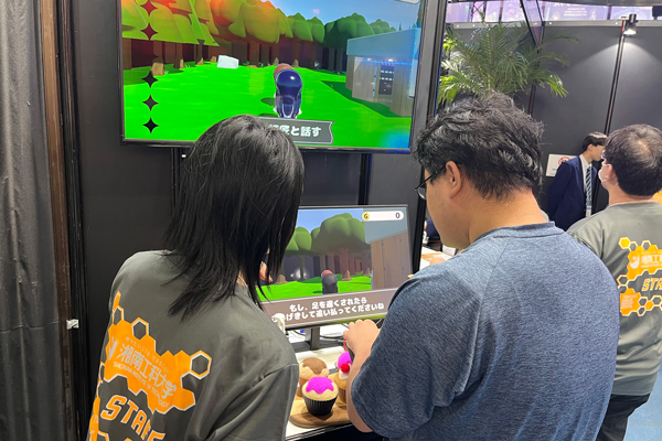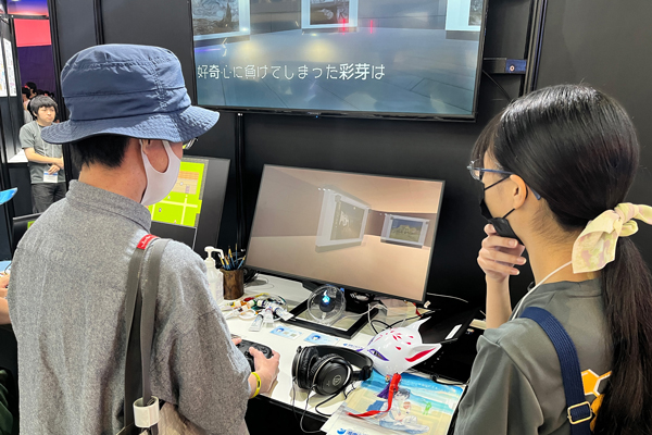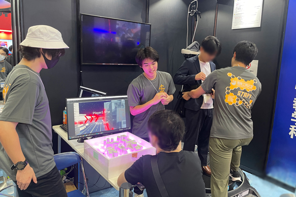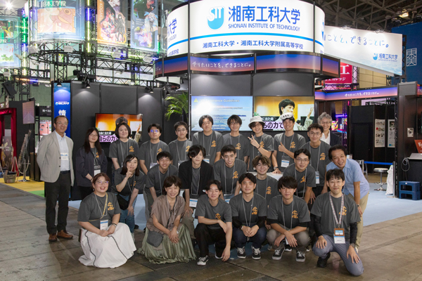 湘南工科大学からは、堀越力教授、本多博彦教授、中茂睦裕教授、清水哲也准教授、橘俊宏准教授、マハブービ シェヘラザード助教、田原雅浩特任講師の研究室および「情報学課題解決実習」、「横断型先端分野学修プログラム(XRメディアコース・AIコース)」の学生ら64人が参加し、制作したゲーム13作品を展示しました。4日間での本学ブースへの来場者数は約2,500人、ゲーム関連企業の訪問がのべ500社にのぼりました。