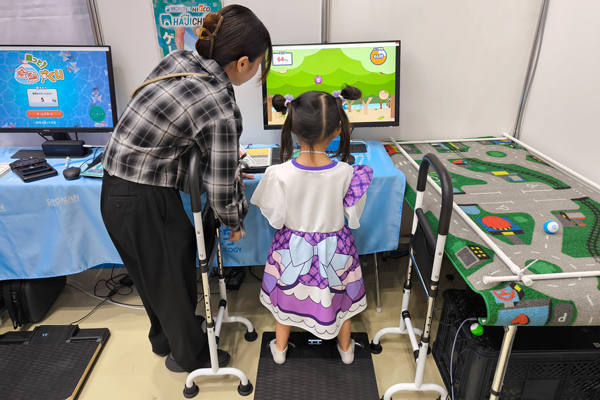 当日は、株式会社ニフコと産学連携で進めている足趾把持力(そくしはじりょく)の測定・トレーニングを促進するためのゲームアプリ、関西学院大学 山本研究室および鹿児島県中種子特別支援学校亀田純教諭と共同で進めているボッチャランプ、任意のオモチャへ組み込める声スイッチを展示して紹介。本学のブースに足を運んでくださった医療・リハビリ施設の関係者、特別支援教育の関係者、当事者家族等に研究成果を体験していただきました。