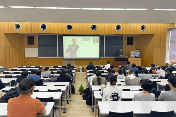 2025年10月13日、工学部 総合デザイン学科の選択科目「インタラクティブデザイン」(堀川将幸教授担当)および「メカトロニクス基礎」(尾﨑文夫非常勤講師担当※)の合同授業において、 UI/UXデザイナー 南地秀哉氏を講師として招いた特別講義が開催され、2・3年次生約50人が聴講しました。