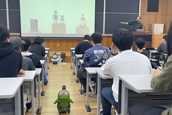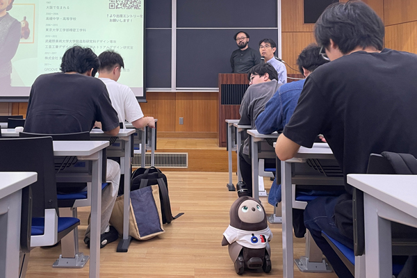 総合デザイン学科では、担当教員の企業での実務経験を基に、実践的かつ社会との接点を育む授業が展開されています。今回招かれた南地秀哉氏は、 家族型ロボット「LOVOT(らぼっと)」を開発・販売するGROOVE X株式会社のソフトウェア領域/アプリチームを本職とし、個人でもプロダクトデザイナーや大学の非常勤講師として活動。ロボット業界を志した経緯や、「LOVOT」と連携するスマートフォンアプリ開発ほか、個人としてプロダクトデザインに携わった枡のおひつ「COBITSU」のプロダクトデザインなど、さまざまなプロジェクトの舞台裏や自身のキャリアなどをお話しいただきました。