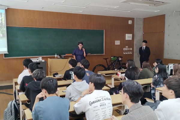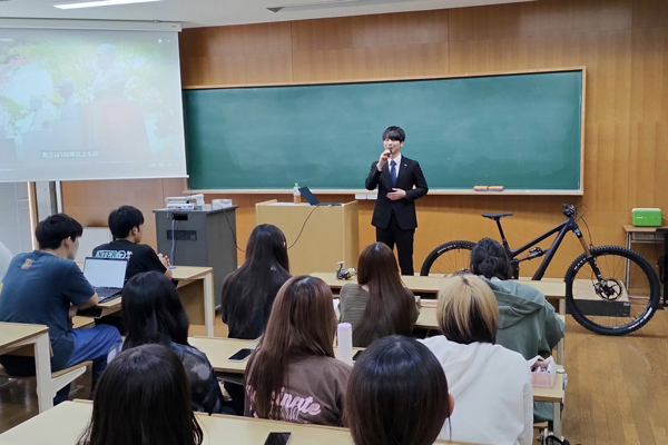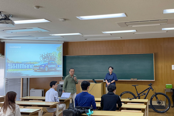講義では、大瀬戸部長より、シマノが大切にしている「機能美と感性の融合」や「人と自然をつなぐデザイン」という理念を軸に、プロダクト開発におけるデザイン部門の役割、具体的な事例等を紹介。また、塩崎氏からは、学生時代の学びや就職活動の経験、現在デザイナーとして大切にしている姿勢について語られました。