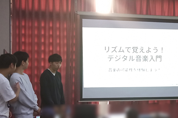 2025年11月1日、藤沢市の片瀬市民センターにおいて、湯浅将英教授の研究室に所属する工学部 コンピュータ応用学科4年の加藤天斗さん、玉田伊織さん、横山雅治さんが、小学生向けのプログラミング教室「Let's Try Katase kids 大学生と一緒に学ぶプログラミング リズムで覚えよう!デジタル音楽入門!」を開催しました。