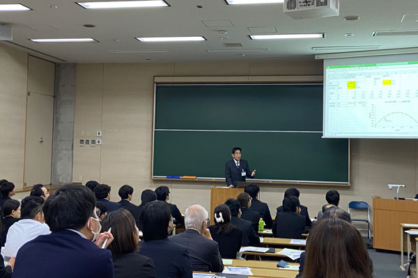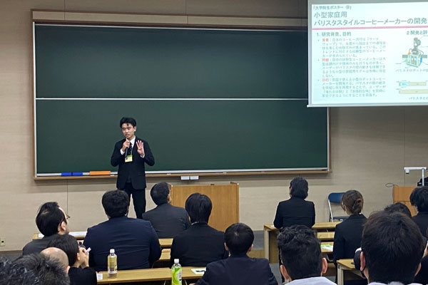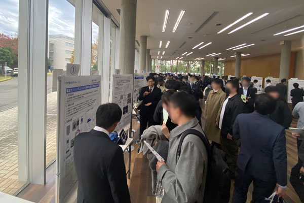 会場では、大学院工学研究科長の北洞教授が講演を行ったほか、教員と大学院生合わせて22件の研究内容を展示ブースやポスターセッションで紹介しました。また昨年に続き、大学院生の研究活動奨励を目的とした「優秀プレゼンテーション賞」の表彰を実施。産学交流フォーラムにおいてショートプレゼンテーションおよびポスター展示を行った研究発表に対し、「研究内容」「ポスター自体の見やすさ、分かりやすさ」「プレゼンテーション技術」の評価項目から参加者による投票を行い、懇親会の場で表彰式が行われました。