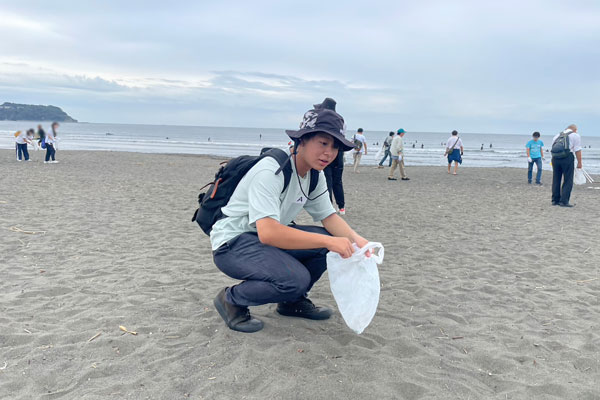 2025年10月4日、社会人基礎科目「社会貢献活動」の実習テーマ「引地川の環境保護」(実施団体:柳と遊ぼう引地川)を履修する情報学部 情報学科 情報メディア専攻1年の花輪 史臣さんが、引地川の河口にあたる藤沢市の鵠沼海岸で行われたビーチクリーンアップに参加しました。
