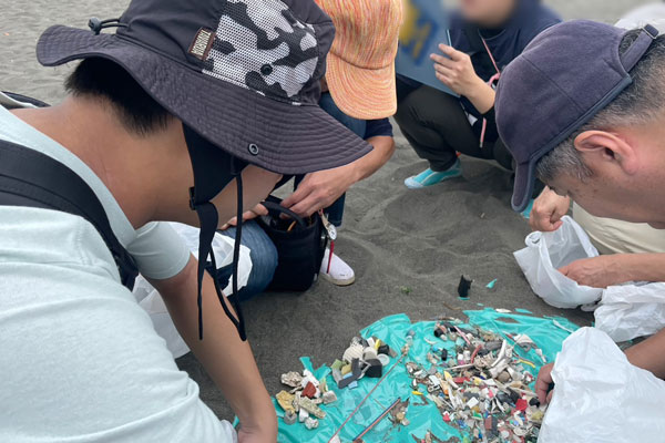 引地川は、大和市上草柳にある谷戸(神奈川県企業庁の水源地)を源とし、藤沢市鵠沼海岸に注ぐ延長21.3キロメートル、流域面積67平方キロメートルの河川です。鵠沼海岸は、引地川の下流から流れ込んできたゴミが蓄積する場所で、集められたゴミの中にはタバコの吸い殻、レジ袋、ペットボトルキャップ、無数のマイクロプラスチック片などがありました。本活動には、プラスチック製造会社の参加もあり、お互いに交流して話を聞くことで、企業による社会貢献の実例を知る機会にもなりました。