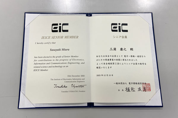 2025年12月15日、情報学部 情報学科の三浦康之教授が一般社団法人電子情報通信学会からシニア会員称号を授与されました。