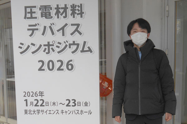 2026年1月22日~23日に東北大学 サイエンスキャンパスホール(宮城県仙台市)で開催された「圧電材料・デバイスシンポジウム2026」において、工学部 人間環境学科4年 眞岩研究室の松本晋太郎さんが研究成果を発表しました。