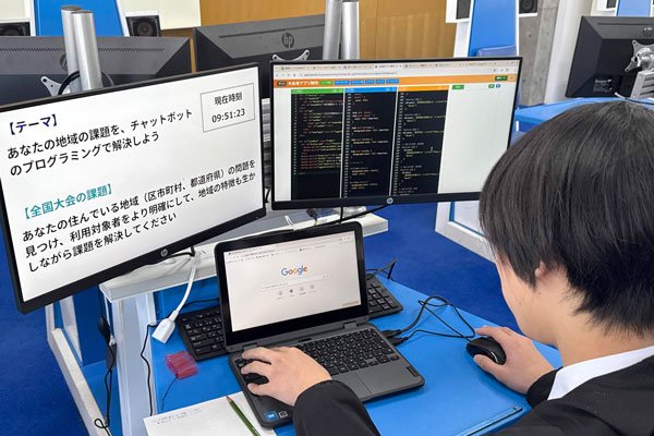 本コンテストは、2017年告示の学習指導要領に示された「ネットワークを利用した双方向性のあるコンテンツに関するプログラミングによる問題の解決」に資する競技部門として、2022年度から実施されています。今回の競技では、全日本中学校技術・家庭科研究会と一般社団法人日本パソコン能力検定委員会が共同開発した専用アプリケーションを使用し、生活や社会の問題を解決するチャットボットの設計・制作が行われました。