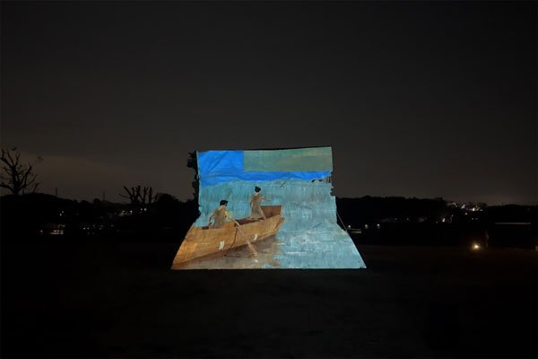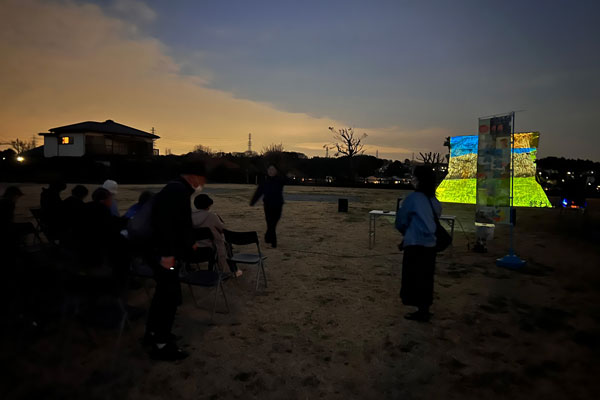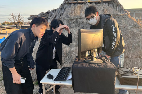 2026年3月1日、綾瀬市で開催された「弥生を満喫!神崎遺跡まつり」において、「情報学課題解決実習3B」で井上道哉講師のプロジェクトを履修する、情報学部 情報学科 情報メディア専攻3年 浅井洋輝さん、栗山冬輝さん、田代匠さん、多並蒼空さん、土橋恒太さんが「プロジェクションマッピング ~神崎物語~」を上映しました。