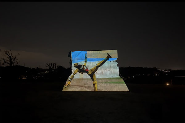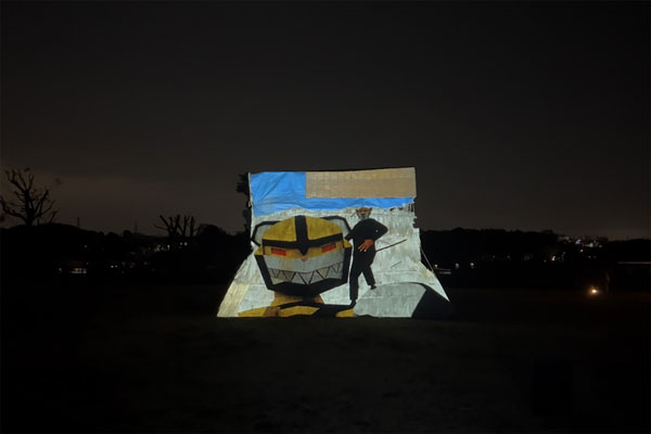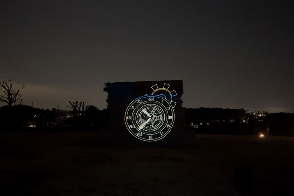 今回のプロジェクションマッピングは、綾瀬市のマスコットキャラクター「あやぴぃ」が弥生時代にタイムスリップし、悪者から神崎遺跡を守り、未来へつなぐストーリーをアニメーションにしたもので、日没後、神崎遺跡公園内に設置されている仮設型復元住居に投影されました。