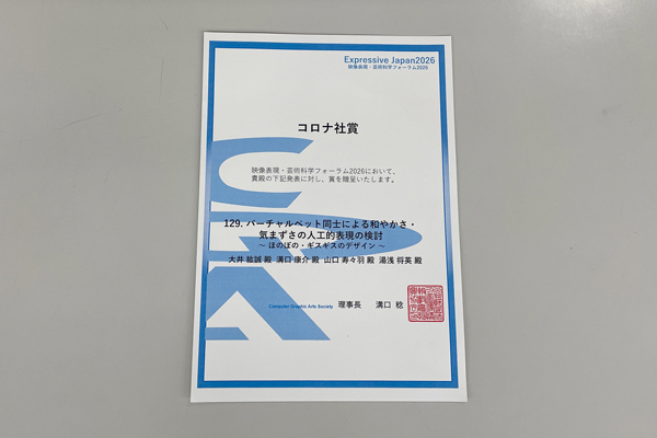 2026年3月2日、東京工芸大学 中野キャンパスで開催された「映像表現・芸術科学フォーラム2026」において、情報学部 情報学科の2~3年次生および大学院 工学研究科 博士前期課程 電気情報工学専攻の1~2年次生が研究成果を発表し、2組の発表が優秀発表賞を受賞しました。また、1組の発表が企業賞(コロナ社賞)を受賞しました。
