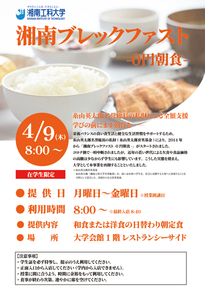 湘南工科大学は、2026年4月9日(木曜日)より、学生に無料で朝食を提供する「湘南ブレックファスト-0円朝食-」を再開いたします。