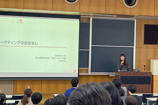 続いて、森永製菓株式会社 マーケティング本部 冷菓マーケティング部 谷山実希氏からは、食品メーカーにおけるマーケティングの業務内容やパッケージデザイン、プロモーションの工夫などについて解説が行われました。