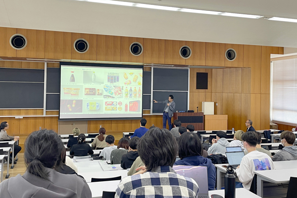 前半は、株式会社GKダイナミックス 金子太郎氏が登壇し、「アメリカ市場に向けた⾷品パッケージデザイン - 海外輸出ビジネスにおけるデザイン貢献 -」をテーマとした、製品を海外展開する際のデザインの特徴や役割などについて、実例をもとにした解説が行われました。3年次生は同テーマによる新しいプロダクトを構想する課題に、今夏の発表に向けて取り組みます。